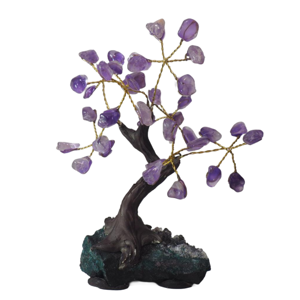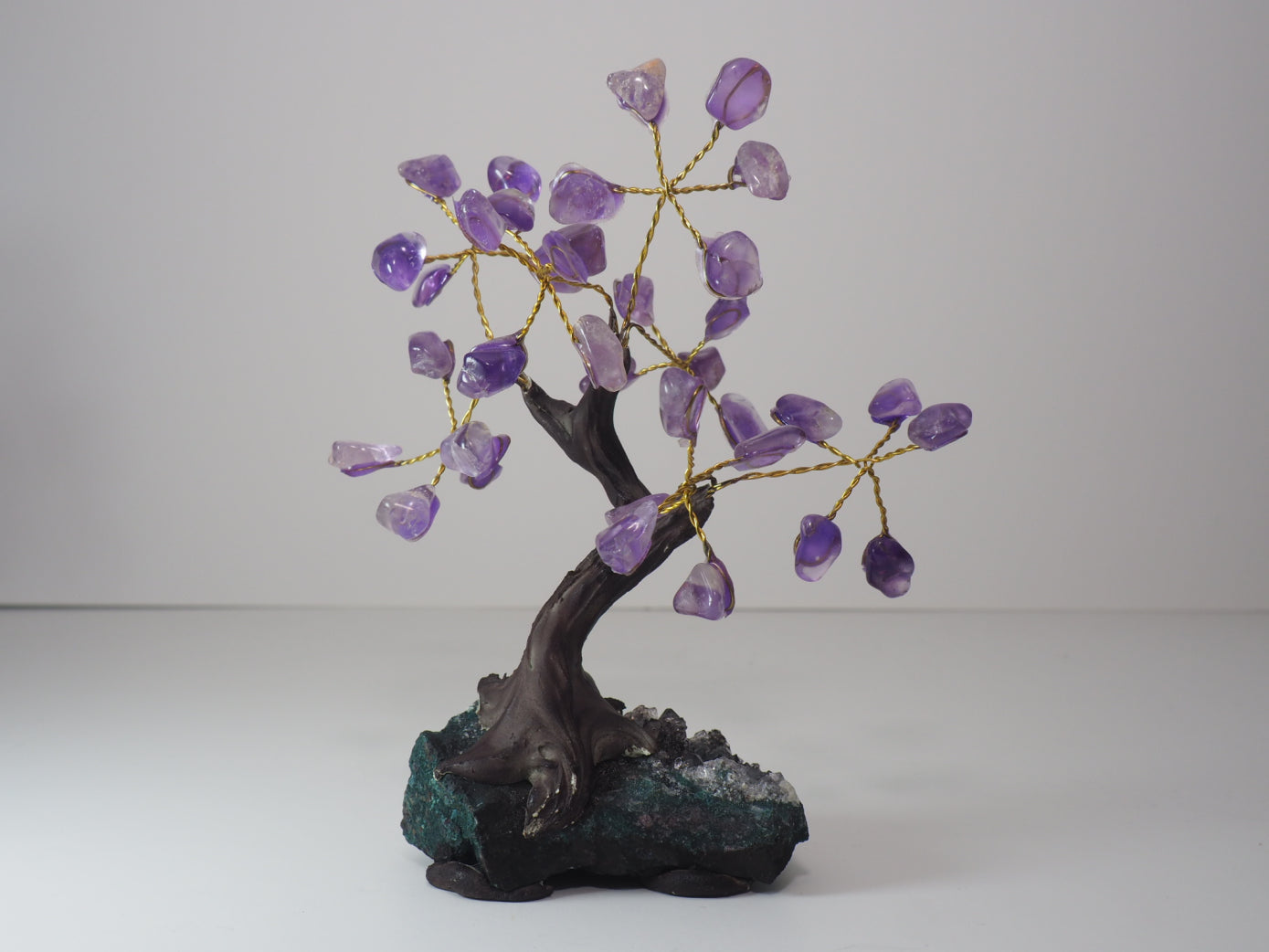 Este hermoso bonsái de amatista está cuidadosamente elaborado para traer serenidad y armonía a cualquier espacio. La base drusa de amatista le da una elegante apariencia y puede ayudar a reducir el estrés y promover la paz interior.