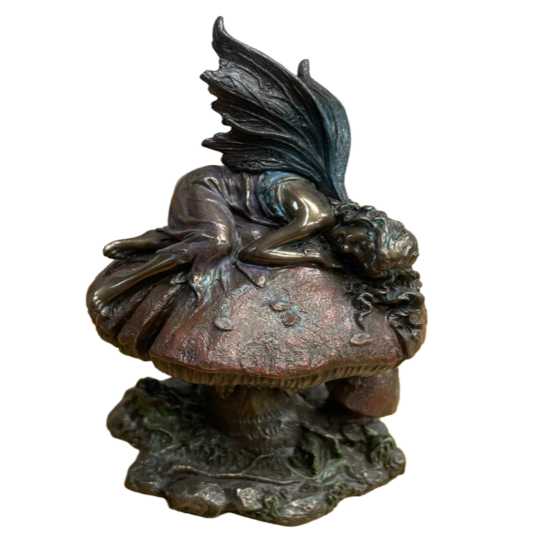 Encantadora figura de un hada dormida sobre una seta mágica, símbolo de los sueños y los secretos del bosque. Representa la conexión con los reinos feéricos y la energía de la naturaleza.