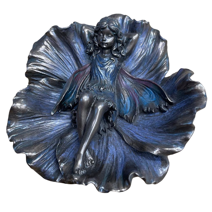 Dulce hada recostada sobre un pétalo en calma, símbolo de la armonía y la conexión con la naturaleza. Sus tonos irisados evocan la magia de los sueños y la energía feérica.