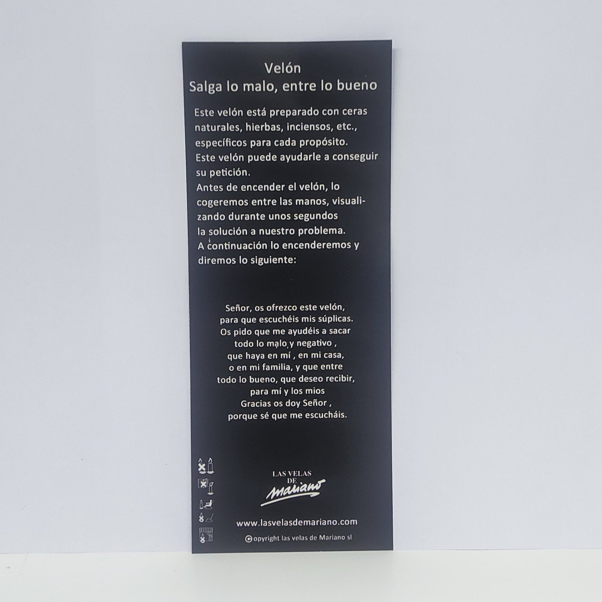 Este velón tiene como propósito alejar las energías negativas y atraer lo positivo. Ideal para limpiar la casa o el negocio de malas vibraciones y bloqueos. Hecho con cera de alta calidad y esencias aromáticas para una experiencia relajante y purificadora.